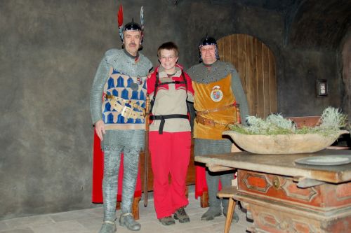 V útrobách hradu nás čekalo příjemné překvapení v podobě možnosti si sáhnout na opravdické rytířské brnění... Tehdejší rytíři prý nosili šat z 18ti vrstev látky, což nezní nijak hrozivě, ale jakmile nám dali obtěžkat jen jeho malý kosek, docela jsme se pod nim prohli. Holt to plechoví hoši neměli jednoduché.