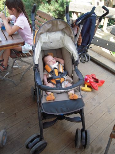 Až ty zážitky zmůžou zejména ty nejmenší. Jáchouš testuje Maruščin kočárek.