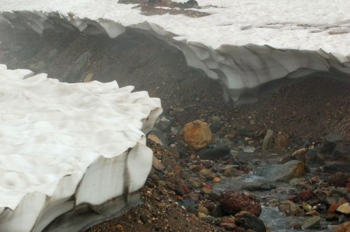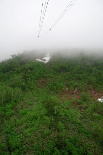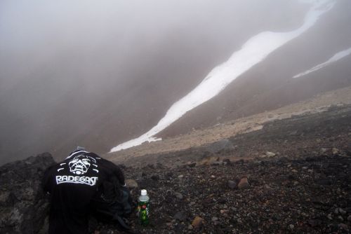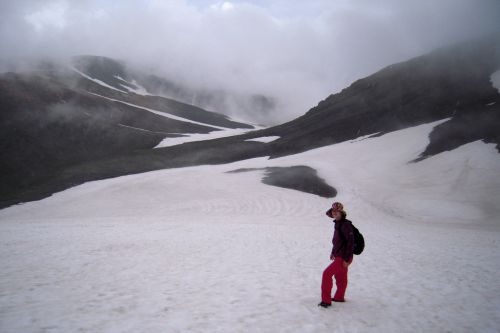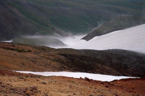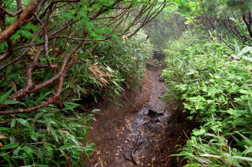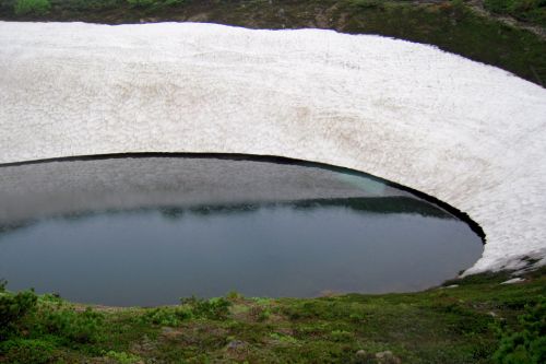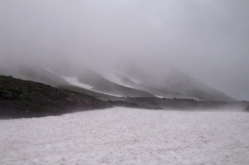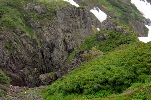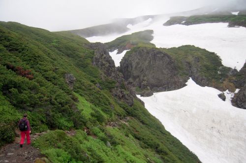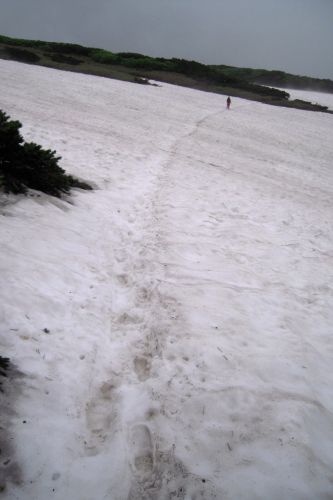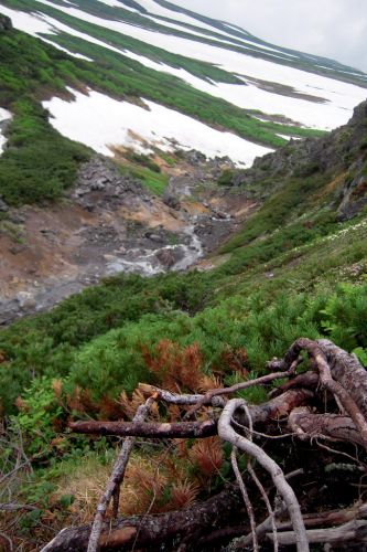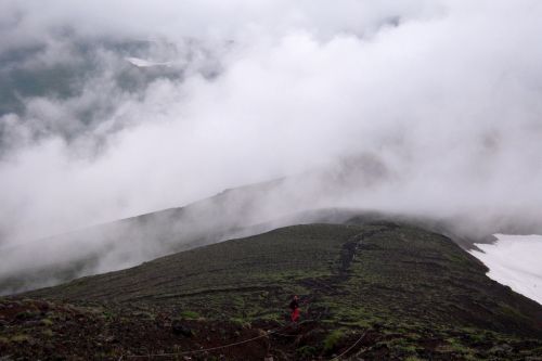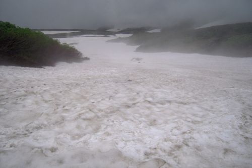 Narozdíl od většiny přítomných jsme se vydali z hory dolů opačným směrem. S námi šli jen dva staříci v plné polní od Ósaky, kteří si krás Daisecuzanu užívali se vším všudy. Hned pod vrcholem jsme narazili na první větší sníh. Jůůů to bylo bezva. Bylo příjemné teplo, ale nadílka jako v zimě. Připadala jsem si na chvíli jako polárník a byla ráda, že jedeme směrem dolů, jelikož z dolního kempu šla jako jeden muž výprava sněhem nahoru, ovšem úplně jinudy. Netušíce, kde je turistická značka jsme šli prostě dolů :) V potůčku v krásném kempu jsme nabrali vodu. Ta byla dobrá, mňam a pokračovali dál doprovázeni slunečními paprsky a kýčovitě nádherným okolím. Spolu s hladem nás po chvíli začaly doprovázet i hromy, tak jsem poprosila šintó bohy Kami, abychom nezažili pravou bouři na horách. Dost možná mne vyslyšeli a skutečně zůstalo celý den pouze u hromování a deště.