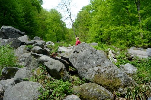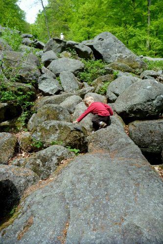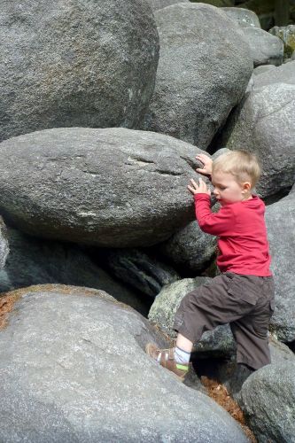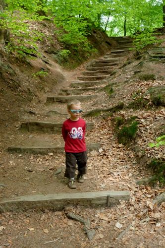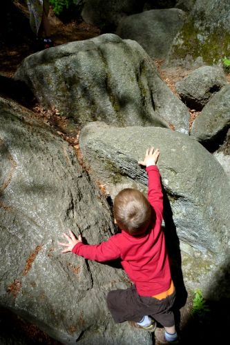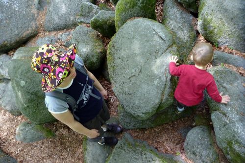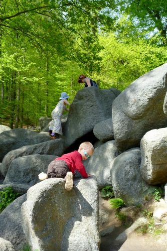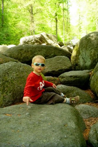V pondělí, když odjel strejda Geboš, který nám dovezl haldu švýcarských čokolád a bednu švýcarského piva (to máme super návštěvy, co?) jsme nabalili batůžky a vyrazili do Odenwaldu na Felsenmeer. Jedná se zajímavý přírodní úkaz, kde je z ničeho nic ohromná halda kamenů, po kterých se dá vyšplhat snad 400 m. Někteří šplhají a funí, zatímco Eliška s neuvěřitelnou lehkostí skáče jako kamzík nahoru a dolů. Jáchym zdolával balvany těžkopádněji, jelikož byly většinou větší, než on sám. Místy mi přišlo, že z něho houževnatost a odhodlání tryská na všechny strany... Opět se ukázalo, že jsme si naivně mysleli, jak náročný program jsme jim to nachystali... Usly opět v půl desáté.