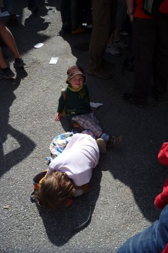 Pochod do hasičárny je bratru asi sedum kilometrů, byl krásný až by se dalo říci letní den. A teprve tady se nám podařilo načapat děti unavené Jachym usnul asi na dvě minuty tatínečkovi za krkem a Eliška si asi na pět minut lehla v hasičárně na zem s tím, že si chce chvilku odpočinout. Po náročném výletě jsme se odměnili zmrzlinou a frčeli domů. V autě neusnul nikdo a unavená jsem byla snad jenom já... Kdo tehda usnul první si už nepamatuju :-)