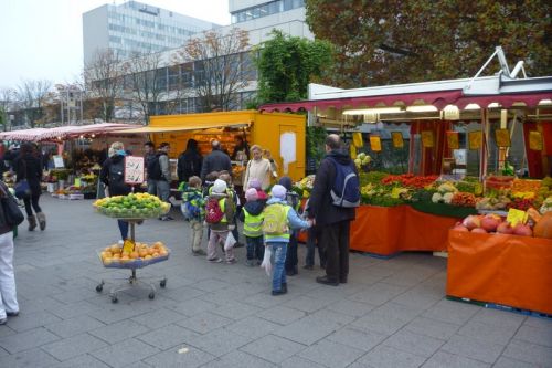 Ve čtvrtek je v Bockenheimu trh. Na snímku je ruská školka na procházce s paní učitelkou, která děti názorně učí jak se co řekne. Momentalně je na řadě česnek. V pozadíje Juridicum