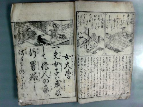 Na poslední seminář roku 2014 na Japanologii nám přinesl profesor Kinski krásnou knížku, kterou ukořistil v antikvariátu v Kjótu za 1000 jenů. Důvodem lákavé ceny byly tu a tam chybějící listy a natolik ošuntělé okraje, že se ono Onna Daigaku 女大學