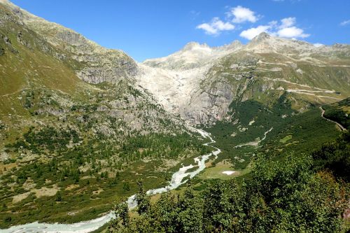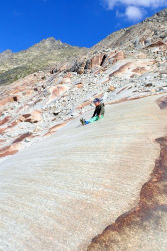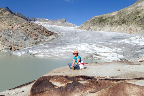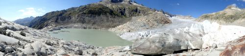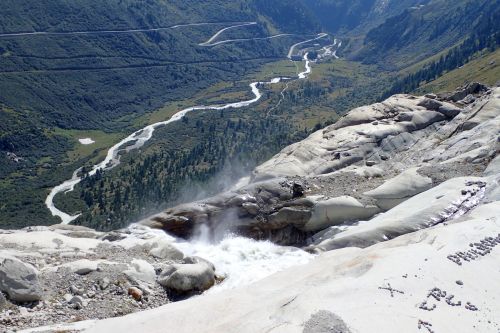 Velikostne neni Rhonsky ledovec zdaleka tak majestatny jako Aletschsky ledovec, o to uzasnejsi ma polohu. Nachazi se vysoko v prusmyku Furka, temer hned vedle silnice Furkastrasse. Voda z ledovce nejdrive steka do takoveho kamenneho "umyvadla", ktere muze mit nejakych 100 metru v prumeru. Z nej prepadem steka (spise pada) ledova a zakalena voda do udoli, cimz vlastne vytvari reku Rhonu. Rhonsky ledovec udajne velice rychle odtava, to je ostatne i krasne videt na Googlich mapach (odkaz zde) - clovek by to jezirko temer nepoznal! Kazdy rok hloubi mistni v ledovci novou jeskyni. Proc to delaji kazdy rok, presne nevim, mozna proto, ze vyhloubena jeskyne behem roku proste a jednoduse odtaje.