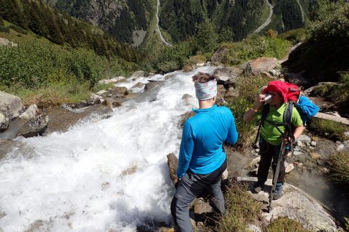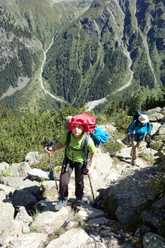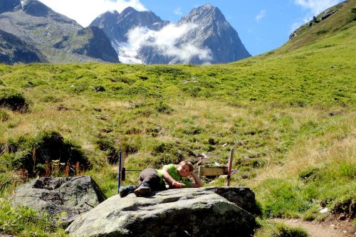 V půl jedné se vydáváme na nejbrutálnější výstup naší výpravy z Plangerossu (1617m.n.m.) do Kaunergrathütte (2817 m.n.m.) Podle značení bychom tam měli být v pět odpoledne. Už od včera víme, že si časy na cedulích musíme násobit dvěma. Chytrá literatura říká, že od osmi let drží děti krok a nemusíme se bát ani pětihodinových výšlapů. I přesto máme strach. Bude to knap. Rozum jsme ztratili kdesi mezi vrcholy a není nám jasný na co Jáchym jede. Vyběhl nahoru, tam kde slovo nebe dostává nový rozměr, bez jakýchkoliv známek únavy. V půl sedmé nás vítá usměvavá hostinská Julia, bere Elišce batoh a gratuluje k výstupu. Všechny tři holky máme dost. Eliška dokonce co nevidět usíná... Malá rodinka a kámošky z Mnichova, kteří žili naším příběhem už na Verpeilhütte nás ujišťují, že jsme se rozhodli správně a gratulují, že jsme to zvládli i z údolí... Prej to nebyla sranda a ukazují nám fotky z Madatschjochu v mobilu... Ještě nepochybujeme a jsme rádi, že jsme vyložili spoustu věcí v autě. Balení jsme vůbec nezvládli. Příště budem chytřejší a když nebude počasí na naší straně. už umíme reagovat na změny :-).