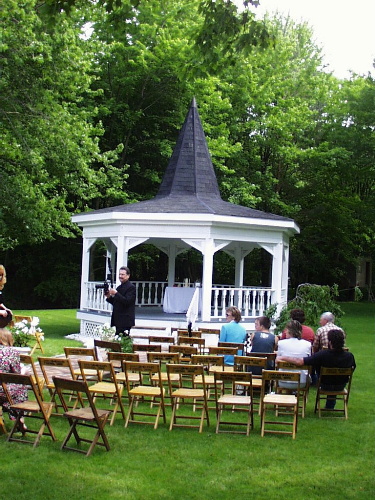 V tomhle altanu se vse odehralo. Pripravene zidlicky jsou pro prihlizejici svatebcany.