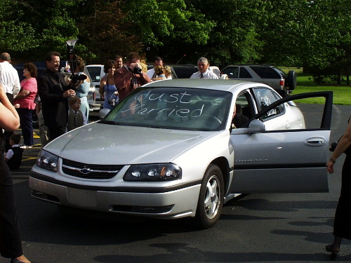 Just married. Novomanzele naskocili do pripraveneho pocmaraneho Cheroletu a za mohutneho troubeni se odjeli podelit o svou radost se zbytkem obce.