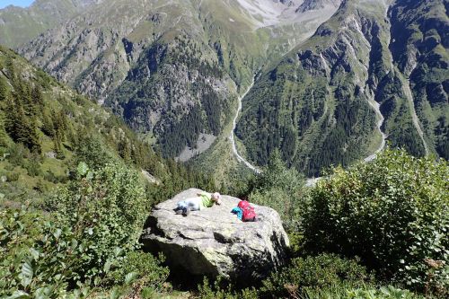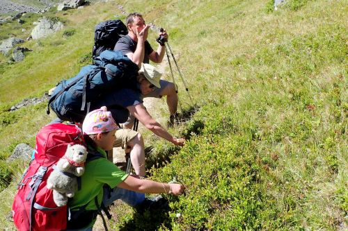 Brácha paní hospodský z Kaunergradhütte seběhne do Plangerossu za 50 minut. My se slanili i se sbíráním borůvek po cestě hodiny čtyři. Nespěchali jsme. Třetí výstup do sedla z údolí jsme si odpustili, jednak některé z nás už bolelo kde co a druhak jsme si chtěli šlehnout tak jak tak jednu jízdu letní kabinou. Právě srovnání zimních kopců s letními nás přilákalo tak vysoko. Původně jsme chtěli jít s baťohem od chalupy k chalupě v Allgäu. Je to blízko a všude se píše, že ideální pro rodiny s dětmi. Hezky pro začátečníky...