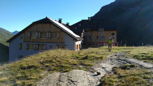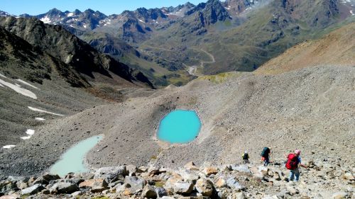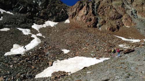 Z Weißssejoch nás čekalo klesání dlouhé, jak týden před výplatou. Jak by nás zajímalo kolik lidí za sezónu frčí na Taschachhaus právě tudy. Potkali jsme v protisměru jednoho pána docela pozdě a navíc BĚŽEL, nikdy bych nevěřila, že je to možný.
