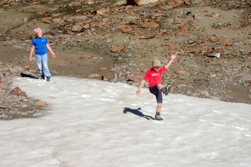Ještě nevybalujem ani oběd a máme nadosah první sněhové pole. To je radosti. Děti si postaví jejich prvního letního sněhuláka, skoro stejný highlight jako svišť, postupně mě oba sprdnou, proč jsem jim nevzala rukavice a jdem dál. Berlínská výprava nás na odpočívadle předběhla a tak jsme se mohli orientovat, kam nás ta pěšina zavede dál. Bylo před námi několik sedel a mezi kameny nebyla stezka vidět. Tušili jsme, přes které se vydáme, ale z které strany, se tam do oblak budeme drápat nám bylo záhadou. Sněhový plotny a do nebe se tyčící vrcholy vzbuzovaly respekt. Nakonec to bylo mnohem jednodušší, než jsme čekali, dost možná i proto, že nám prošlápli sněhem stabilní pěšinku Berlíňáci. K našemu údivu jsme na vrchol sedla lezli zleva, tedy po skále. Naši dvounozí kamzíci ožili, ja měla dost. Nevím, jestli to tam nahoře bylo tak krásný kvůli těm jezírkům, ledovcům, dokonalému klimatu nebo luxusnímu oříškovému chlebu z Taschachhausu a je to úplně jedno. Tady stojí za to být. Připadala jsem si jako horolezec na Everestu a cítila nebetyčnou pýchu, což tady v nebi není vůbec složitý, že jsem se sem s báglem vyškrábala. Do křesla mě usadil až článek na blogu nějakých cyklistů, kteří tudy JELI NA KOLE V DEŠTI. Máslem jsem a máslem zůstanu. Jakou radost jsme tady nahoře měli, když jsme dokázali lokalizovat na protějším kopci kavárnu na konečné "Divokošpicové lanovky." Právě tady jsme si uvědomili, že je dovča za náma, od teď už jsme zase zpátky v Kaunertalu.