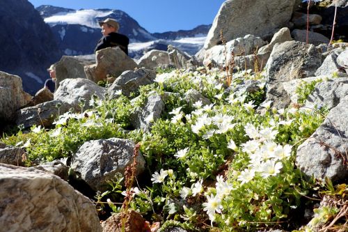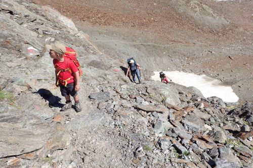 Vyrážíme do Gepatschhaus. Eliška v prvním potůčku uklouzne na kameni, jejda omylem, a nabere si vodu. Převlíká si ponožky, ty poslední. Na zejtra zbývají už jen smradlavý nebo dnešní sušený. Vypadá to, že dneska stejným směrem ještě jedna skupinka mladých "alpinistů", Eliška později zjišťuje, že jsou z Berlína a jdou tu naší vysoce originální trasu taky, jen vyrazili o den později :-). Průvodce, letáčky i personál chaty upozorňuje, že se tady chůze po cestičce nazývá "vysoký alpinismus"´. Líbí se nám to. Mezi kameny se to hemží barvami. Konečně jsem pochopila zahradní koncept "skalka" až dnes a tady... Taky jsme si v průvodci rozšířili slovní zásobu v oblasti různých kamenových podloží.