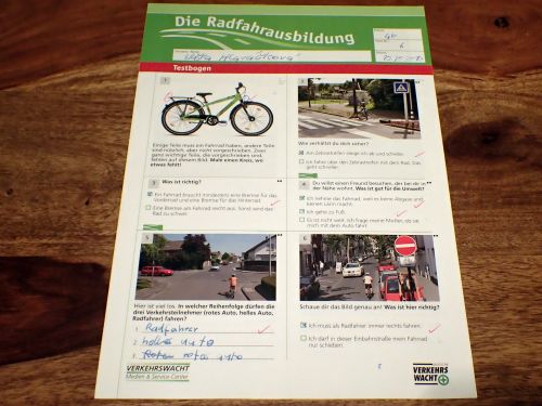 Praktická část cyklistického vzdělávání probíhá pět dní, které určí pověřený odbor hesenské vlády. Z Wiesbadenu na ně přijede policistka a policajt, kteří během prvních dvou dní postaví na dvoře značky a testují, jak na tom děti jsou. Nicméně údajně až potom, co obdrží samolepku, že je jejich kolo způsobené jízdě na silnici, tudíž má všecky odrazka a blikátka a světýlka. V praxi to tak přísné není a stačí to doladit do zkoušky. Během těchto prvních dvou dní jsou ze zkoušek postupně vyloučeny děti, které si nejsou dostatečně jisté. V našem případě to byly tři z dvaceti.