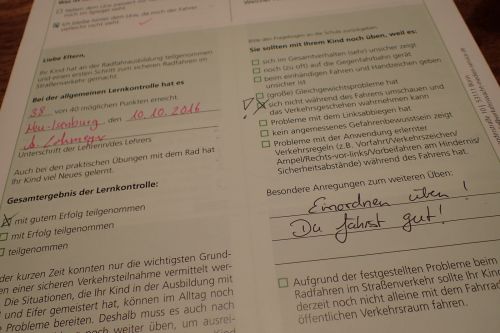 Myšlenka i provedení mi příjdou fajn. Co mi, ale dělá starosti jsou postupně vyřazované frustrované děti. Už na základce mi říkal třídní ať si dám pozor na pusu, že se mi to jednou vymstí, jenže jsem asi nepolepšitelná a i tento aspekt jsem nadhodila.(Co vám budu povídat, byl to sympaťák.) Muž zákona opáčil, že jemu samotnému je těch dětí opravdu líto a že je třeba jasně říct, že to není chyba jejich, ale jejich rodičů. Kromě tří ke zkoušce nepřipuštěných jich dalších šest neprošlo a výsledné hodnocení u těch úspěšných se zpravidla hemžilo křížky, co je třeba zlepšovat. Podle Elišky jsou emoce ve třídě napjaté. Někteří jsou smutní, jiní naštvaní. Devět dětí z 22 nedostalo doporučení pro rodiče, že jejich dítě smí jezdit na kole v provozu. Z výsledků je jasné, že strašák jménem Fahrradausbildung má jasně oprávněný základ. Ano, na jednu stranu jsem ráda, že se to samo zařídilo, ze moje dítě umí dopravní předpisy na rozdíl ode mě, která jsem se je učila až v autoškole, ale vůbec si nejsem jistá, jestli to jsem schopná docenit s vědomím, že na druhé straně stojí tolik z mého pohledu zbytečně frustrovaných dětí...