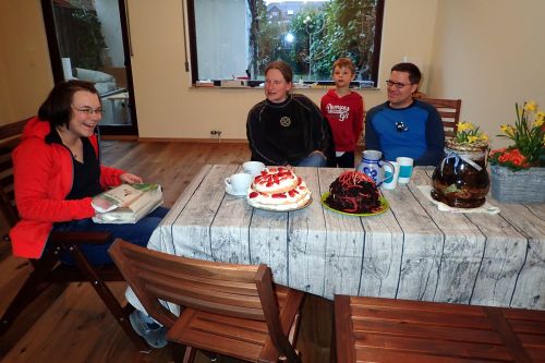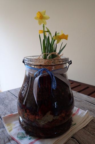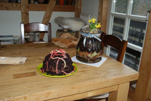 Hned za ním vykukovala kočková teta s žížalovým dortem od dity P a širokánským úsměvem. Než jsem se nadála stál na stole, kterej už na chalupě konečně taky máme, takový netradiční narozeninový pugét...  Narcisky seděly pěkně na žížalkách, se kterejma jsme se seznámili vlastně až ráno, jak jsme vytáhli žaluzie...  Než jsme dosnídali, byly zase zahrabané v odšťavněné mrkvi a humusu.