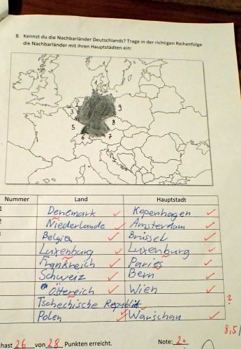 Eliška přinesla s brekem písemku ze sousedních zemí Evropy, kde zapomněla vyplnit hlavní město České republiky.Bylo mi jí úplně líto s jakou vážností vnímala rádoby trapnost celé situace, jakkoliv to přišlo nám rodičům úsměvné. Ani paní učitelka si neodpustila otazníček :-).