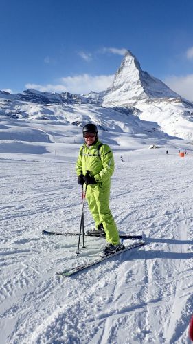 Kromě sněžnic a večerní procházky jsme si ale nenechali ujít ani ty lyže, alespoň, co počasí dovolilo. Na dva dny jsme si rozložili tři údolí Zermattu. To "italské" bylo skoro celé zavřené, na azuro jsme zvolili část pod observatoří, kam nás a spousty asijských turistů v civilu dovezla zubačka Gornergrat (3135 m.n.m). Podle toho, jak se Otík tetelil blahem, jsem pojala podezření, že je to asi jeden ze splněných snů, ale psssst (po čtyřicítce se do toho pěkně obul a začal své sny realizovat, až by o tom mohl napsat nějakou chytrou knihu, která by se omylem stala bestsellerem).