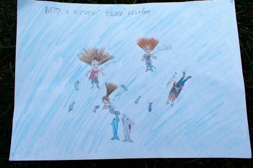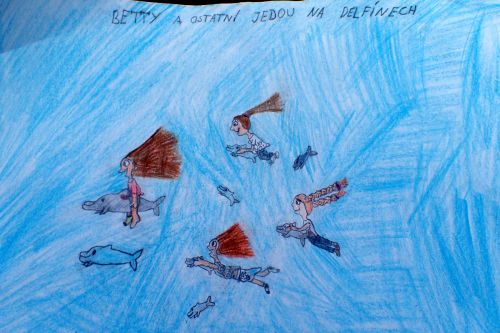 Neviděla ho. Spolu se vynořily nad hladinu a rozhlížely se… tam, tam vzadu se zrovna vynořila ploutev! Vydaly se tím směrem. Ponořily se a uviděli jej - Betty jej hned poznala, byl to ten její delfín, ale to nejlepší na tom bylo, že on nebyl sám, ne, to teda nebyl! Byl tam ještě jeden delfín a ještě tam bylo hrozně moc malých delfíňátek a ta byla tak roztomilá! Betty tomu nemohla uvěřit, bylo to tak rozkošné! Eliška a Saša si hned každá chytila jedno delfíňátko a hladily jej, Majda se jich trochu bála, ale pak si řekla: „Co mi ty delfíni můžou udělat?“ a dala se taky do hlazení…
