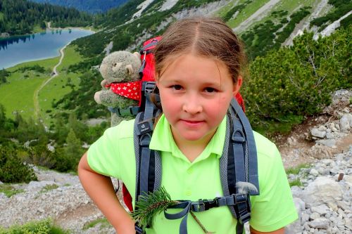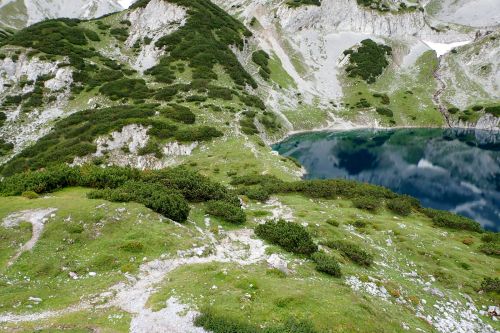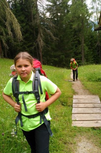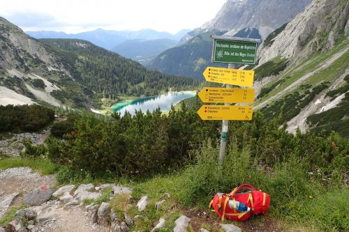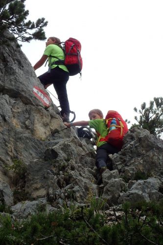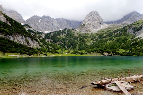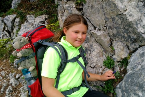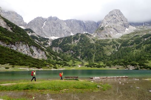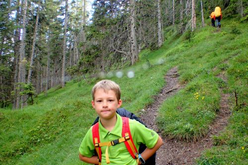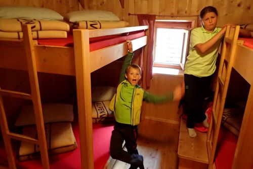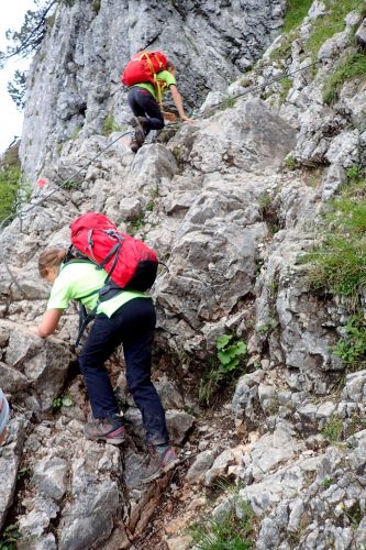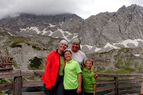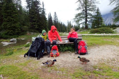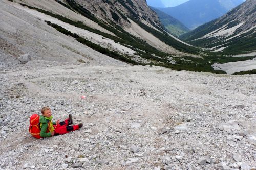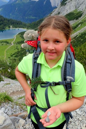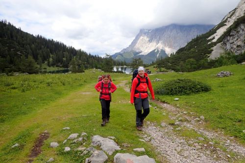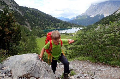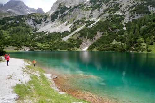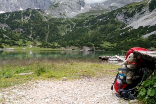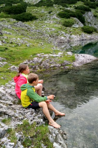 Když se na naše letošní putování ohlédnu, tak se mi zrovna tenhle den líbil nejvíc. Z údolí měkoučkým lesem až na lesní hranici. Kleč ve skalách, kde na turisty čekají pomocná lana. Tady už si krátkonožec s nohama nevystačí a musí na čtyři. Nicméně to trvá tak akorát dlouho, aby si to člověk užil a nezačala se ozývat nejaká ta přetížená součástka organizmu. Zrovna když je to tak akorát, přivítá vás nádherná louka plná alpských květů a zvonce pasoucích se krav. Po pár krocích se vyklube krásné jezero Seebensee, kde je dost laviček pro příjemnou sváču. K chatě už chybí jen nastoupat posledních 300 metrů příjemnou cestou klečovitým voňavým terénem. Při pohledu na jezero z nadhledu jsem si vzpomněla na Pleso nad Skokom v Tatrách, které člověk míjí cestou na Bystré sedlo. Tahle prochajda je zkrátka všechno v jednom, co se tak dá v Alpách zažít. Někteří lidé na Coburger Hütte zůstávají několik dní a podnikají jednodenní výlety do okolí. Hned u chaty je i krásné Dračí jezero a i když nám počasí tentokrát úplně nepřálo, běžely si děcka alespoň koupat nohy.