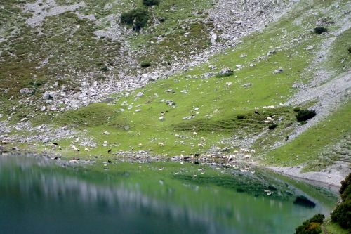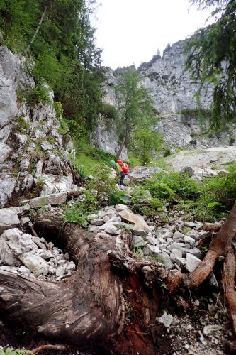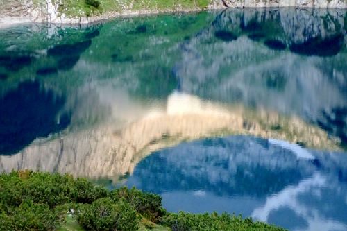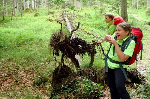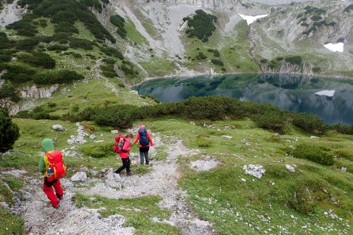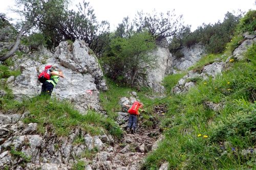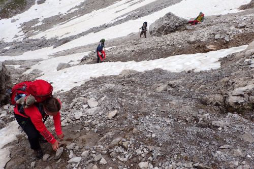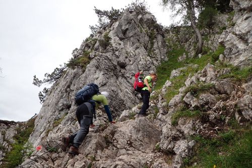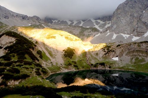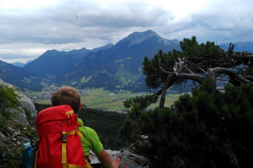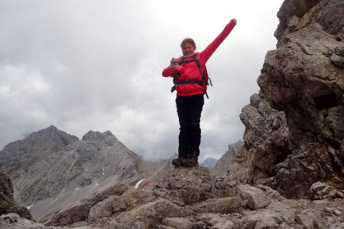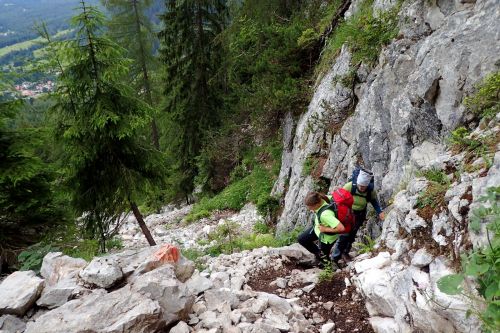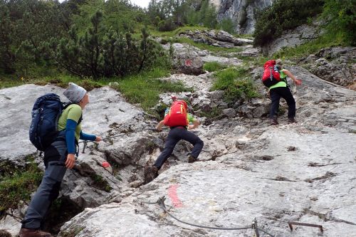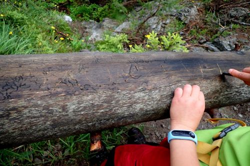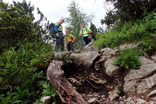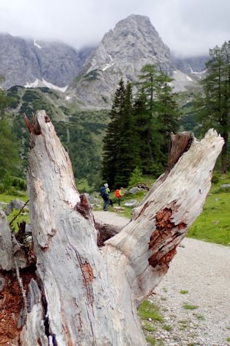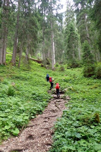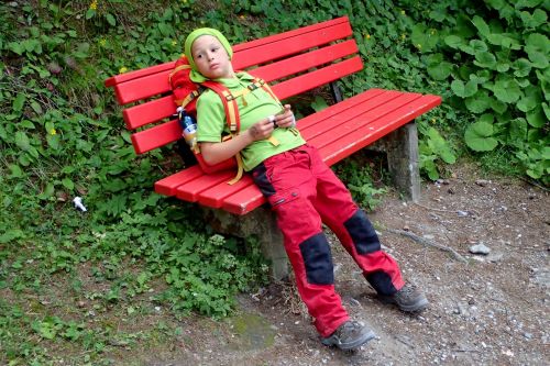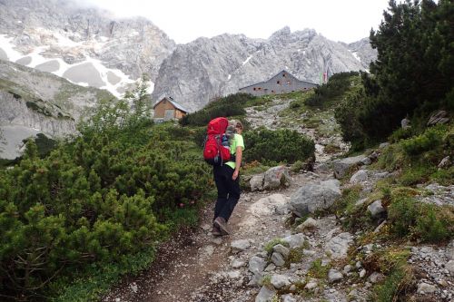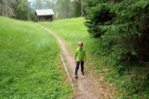 Když se na naše letošní putování ohlédnu, tak se mi zrovna tenhle den líbil nejvíc. Z údolí měkoučkým lesem až na lesní hranici. Kleč ve skalách, kde na turisty čekají pomocná lana. Tady už si krátkonožec s nohama nevystačí a musí na čtyři. Nicméně to trvá tak akorát dlouho, aby si to člověk užil a nezačala se ozývat nejaká ta přetížená součástka organizmu. Zrovna když je to tak akorát, přivítá vás nádherná louka plná alpských květů a zvonce pasoucích se krav. Po pár krocích se vyklube krásné jezero Seebensee, kde je dost laviček pro příjemnou sváču. K chatě už chybí jen nastoupat posledních 300 metrů příjemnou cestou klečovitým voňavým terénem. Při pohledu na jezero z nadhledu jsem si vzpomněla na Pleso nad Skokom v Tatrách, které člověk míjí cestou na Bystré sedlo. Tahle prochajda je zkrátka všechno v jednom, co se tak dá v Alpách zažít. Někteří lidé na Coburger Hütte zůstávají několik dní a podnikají jednodenní výlety do okolí. Hned u chaty je i krásné Dračí jezero a i když nám počasí tentokrát úplně nepřálo, běžely si děcka alespoň koupat nohy.