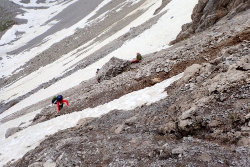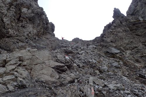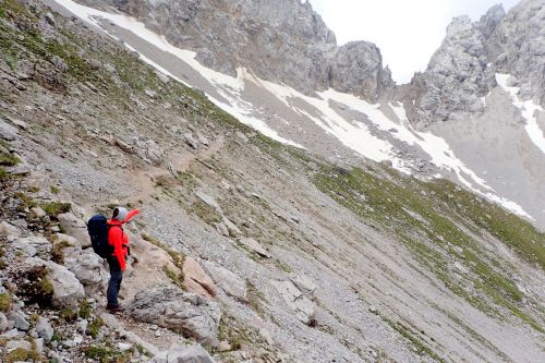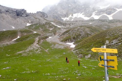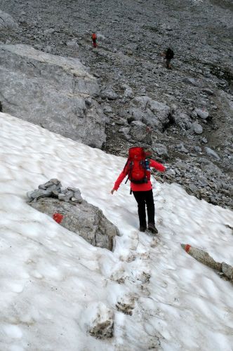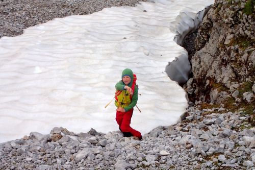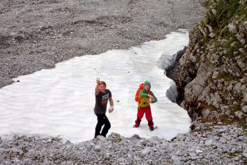 Nejdřív jsme ale museli zdolat sedlo Grünsteinscharte. Nebyla to žádná sranda. Naštěstí jsme na to nebyli sami. Snejnou cestou se vydali i amíci z Chicaga, kteří se na zpáteční cestě z Islandu rozhodli, že se jim vlastně nechce do Vídně a radši si zajdou ochutnat Alpy. Navzájem jsme si pomáhali a hledali nejoptimálnější cestu. Eliška zase ochutnala situace, kdy se ujistila, že se bez angličtiny životem nikam nepohne, protože když na ní Matt řval:"Be careful, it is really really slippery here, stone is falling!!!", vypadala fakt frustrovaně. Naštěstí Mattova přítelkyně studovala na univerzitě němčinu, tak mohla vyzpovídat alespoň ji :-) a schytala jsem to ja: "Mami, ona vůbec nedělá žádný chyby ve členech a koncovkách při skloňování, to není, jak ty! ...Ale zase teda dělá jiný chyby, který neděláš zase ty, a to je teda, co říct." Nění nad upřímné milující děti, že. Společně jsme se nahoru vydrápali a byli opravdu vděční, že nepršelo! Cesta do údolí byla náročná a nekonečná. Amící nám zdrhli a potkali jsme se až v pátek v Imstu a poslali jsme je do kavárny o které jsme jim vyprávěli. Ještě jsme si prohodili pár mejlů, kde jsme si vzájemně sdělili, že jsme byli rádi, že nás osud svedl na chvíli spolu. Naše setkání v Imstu byla opravdu milá třešinka na dortu. Než jsme se tam ale doťapali, zažili jsme spoustu dobrodružství... Den byl dlouhý, tak to zkrátím. V údolí v Obsteigu jsme toho měli všichni plný zuby a začalo pršet. Byli asi čtyři odpoledne od Simmering Almu nás dělilo převýšení asi 800 metrů. Vidina večeře bylo asi to, co nás tam dotáhlo a nahoře v hrozné mlze navíc zmizela Eliška. Přišla ke kapličce, široko daleko neviděla žádné stavení, tak se otočila a šla zpátky. Otík jí naštěstí našel rychle, ale zatrnulo nám nehezky. Sama pak nemohla věřit, jaký kousíček od chaty byla, když mlha odjela...