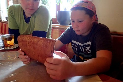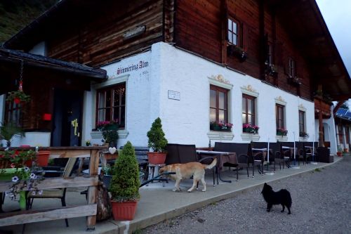 Chatu provozuje bývalý záchranář a trenér lavinových psů. Skvěle zde vaří jeho syn. Ve světnici plápolá oheň v kachlových kamnech. No, po náročném treku je to nejvíc... Dodnes nám nevěří, že jsme přišli z Coburger Hütte... Vyptával se, jestli takhle chodíme po Alpách s baťůžkem a my na to, že jsme byli zatím jen jednou. Šibalsky se na nás usmál pod fousy a zeptal se:" Na Kaunergrathütte jste byli?" Uznale pokýval hlavou, když Eliška špitla, že s babičkou :-). Pak nám vyprávěl, jak trénoval toho černého lavinového psa, co na Kaunergrathütte v nebi bydlí. Mně tak baví ty mikrosvěty, kde se všichni znají.