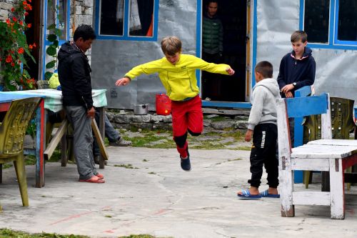 Our guide Nima was always very careful and patient. He was always interested in our desires and needs. We could (and sometimes had to) change our plans according to new impulses, ideas and circumstances. I really liked his warmhearted relationship to our kids on the trek and his endurance to answer their (sometimes not very intelligent :-) questions. On the track, we learned a lot about the fauna and flora of Langtang and the Tibetan culture. This applies even more for the kids who grow up in comfy Europe, as they could spend time in the kitchen watching how the meal is cooked on the fire stove. I loved to watch the kids learning a jumping game called "Tiger".