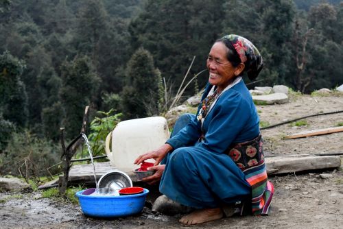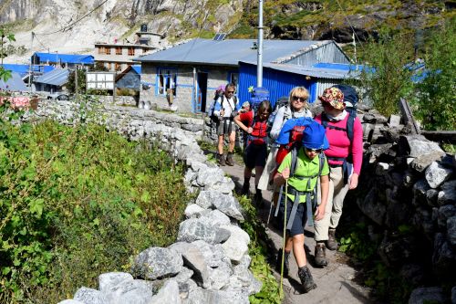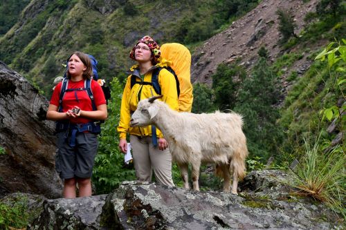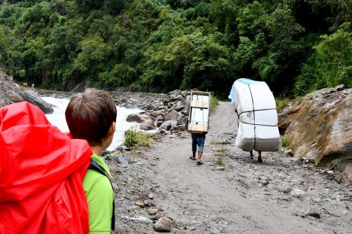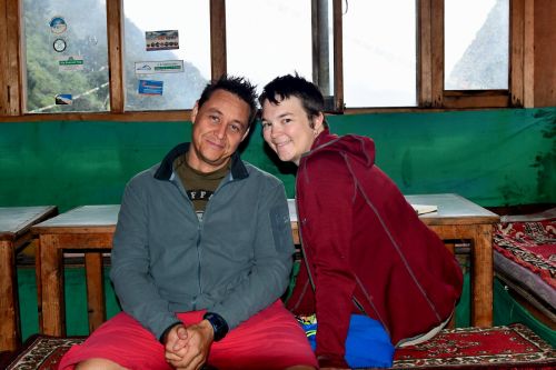 S vodou se tu nešetří, ta teče z hor 24 hodin denně a nejde ani ztišit ani vypnout. Je pěkně studená a myje se v ní venku nádobí nebo zelenina, pere se v ní prádlo. Pere se dennodenně a sluníčko nejen suší, ale i nabíjí a ohřívá. Takže si ledaskde můžete užít i docela teplou sprchu nebo si můžete koupit třeba i nějaký data na wifinu (jakože za tu vodu? - pozn. ov) (Jakože díky tomu slunečnímu záření, co nabíjí a ohřívá soláry. -Pozn ah). V každém čajovém domku nás zaskočil velký odpadkový koš. Všude jsou k mání sušenky, minerálka, Coca-cola atd. Lahve se údajně docela sbírají a odevzdávají v údolí na recyklaci (nejsem si jistá, jestli tomu mám věřit), zbytek odpadků se v horách údajně pálí. Podél cestiček se válí odpadků více či méně, ale údajně je odhazují hlavně místní nosiči, kteří o ekologii nic netuší, a že jich tu pár každý den projde tam i zpátky. V lodži na River side jsme se potkali s milým párečkem Čechů, s nimiž jsme si náramně padli do noty, takže se dokonce na dva dny přidali k naší šnečí výpravě. Na rozdíl od nás přišli pěšky až z Kátmándú a po výletě v Langtangu je ještě čekal výstup na Mera Peak (to je už výstup se vším všudy!). A jak tak šli, Janek, vášnivý ekolog, sbíral cestou ty sušenkové obaly a flašky od Coca-coly, zatímco mě tížilo černé svědomí, že nemám sílu to dělat taky, protože normálně po Taunusu odpadky sbírám taky... Vyprávěl nám u toho o mracích, což strašně zajímalo naše piloty, popisoval, jak si řeka vykousávala svojí cestu a kde všude byl ledovec. Hodiny vydrželi Pavla s Jankem poslouchat děje Eliščiných literárních děl... a že to není jen tak! Tihle dva nám zůstanou ve vzpomínkách asi pěkně dlouho!