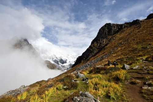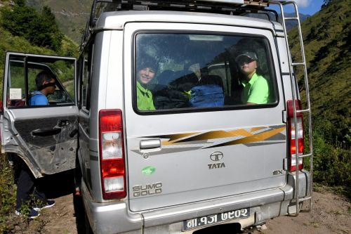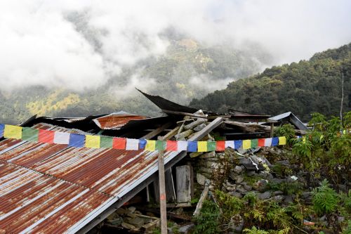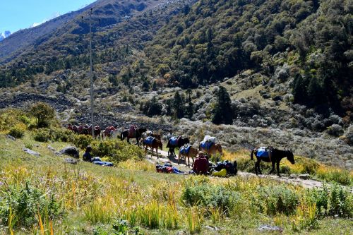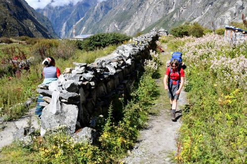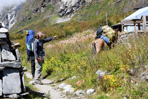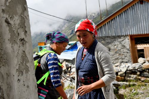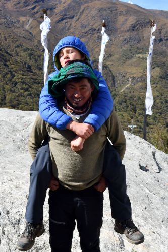 Další dobrodružství začalo v noci, kdy se porouchal termostat Jáchymoj a jako bonus ješťe zvracel. Asi se mu zdálo o tom vrtulníku. Jenže ráno o sobě Nyima řekl, že je silák, půjčil si od švagrové šátek a hodil si Jáchouše na záda. Otík též nebyl úplně fit, ale nahodil si dva bágle na záda a vydali jsme se na sestup směrem k Nyimovi domů do Thulo Syabru. Cestou nám Nyima stopnul "prázdný" muly a poslali jsme s nima dva bágle napřed do dnešní cílovky "Buddha Guest House", abychom mohli líp rozložit váhu, když nám dvoje záda vypadla. Jáchym se v průběhu dne postavil na nohy a bylo mu líp a líp. Následující ráno hlásila termoregulační chybu zase Eliška a den na to Susan. Nikdo netuší, co to bylo za jednodenní virózku, ale tím, že napadala jednoho za druhým nezávisle na nadmořské výšce, výškové nemoci to nepřipisujeme. Průběžně jsme měnili plány na základě aktuální situace. U Buddhy jsme jeden den zůstali, bo bezvládnou Elišku nikdo nosit nechtěl. Když odpadnul Susan, tak si zavolal Nyima na pomoc švagra, který dělá taky průvodcovský zkoušky a střídali si batoh a Susana. Lokální lidi mají vždycky něco do sebe :-)