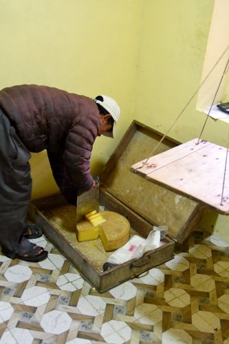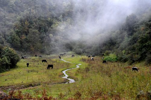 Jáchymovi se z toho výhledu na zasněžené hory začalo chtít děsně lyžovat, velmi rychle si osvojil Nyimovu skalní běhací techniku, která mi stále nejde na rozum a začal se klouzat (rozuměj lyžovat) z vrcholu dolů... Na oběd už byli v chalupě zpátky. Odpoledne jsem se postavila na nohy a vydala se s Otíkem na kopec ještě trochu pomnožit krvinky. Neohroženě jsme měli namířeno stezkou mezi stádem jaků, velitel stáda na nás ale náladu neměl a významně na nás pokynul svejma naleštěnejma rohama (nevšimli jsme si, že jsou mezi jaky i mladí). Jelikož nás vyhodnotil, jako ty méně chápavé, tak se ještě vztyčil na zadní, předníma kopytama se po Nyimojachoušovsku slastně zabořil a sklouznul směrem k nám. Když si trochu zapřeháním, tak jsem už cítila ten naleštěný růžek v ledvinách a říkala si, za jak dlouho tady asi může být ten vrtulník. Normální hysterka, no. Někdy se mi to v Asii stává... Otík ocenil jačí eleganci a koordinovanost pohybu, protože to je fakt obří zvíře a se stoickým klidem pronesl něco jako: "Jé, tudy bychom asi chodit neměli." Hodili jsme zpátečku a stádo obešli. Pak jsem to měla celý týden na talíři, když jsme potkávali jaky v lese. Jinak jsou ale hrozně hodný a mírumilovný a z jačího mléka je super sýr. V Kyanjing Gompa Švýcaři zafinancovali stavbu sýrárny, kola tu nechávají zrát 3 měsíce, no co vám budu... Taky jsme začali sejrařit. Berem mléko kozí a ovčí z farmičky ve Schmitten, ale o tom jindy:-)
