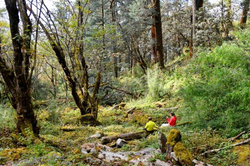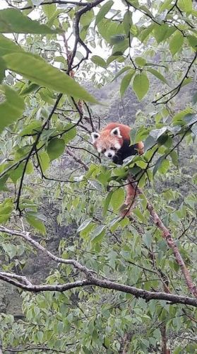 Nyima nás protáhl džunglí, která byla čím dál divočejší. Připadala jsem si jako Mauglí. Jakoby nás někdo přesadil do sci-fi filmu. Kolem tří tisíc metrů už bylo všude jen vlhké divoké zamechované několikavrstvé zeleno. Stromy šustily, jak se po nich honily veliké opice s černobílým obličejem. Myslela jsem si, že se mi to zdá. Červené pandy chodí na bambus, ale opic a jaků se bojí. Žádnou jsme nezahlédli až k posedu, který ochranáři loni postavili ve výšce cca 3500 metrů dost možná proto, že zrovna pod ním leželo několik čerstvých jačích koláču. Měli jsme smůlu, že šli zrovna ten den tak vysoko. Už jsme neměli čas jít džunglí ještě výš, takže nakonec byla naše mise neúspěšná byť měla 90% naději na úspěch. Tak to zkrátka někdy chodí. Aby nám to nebylo líto, poslal nám jednu pandí fotku Nyima :-)