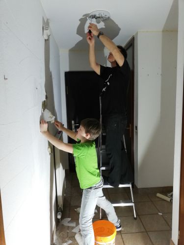 Chlapi sundávaj starý orvaný tapety, bo v době koronové krize mají řemeslníci víc volných dní v kalendáři.