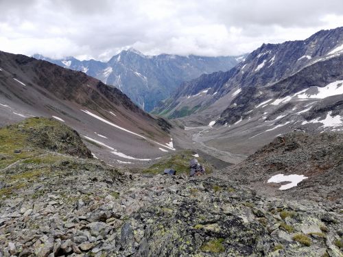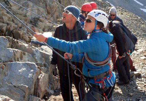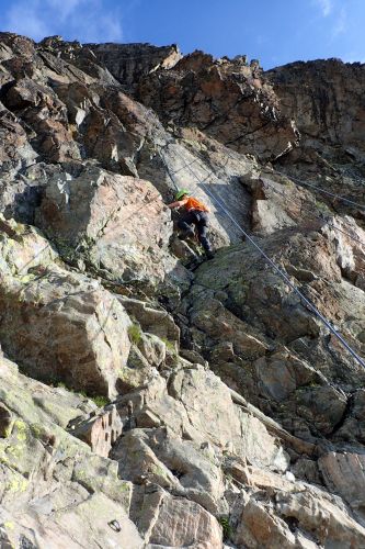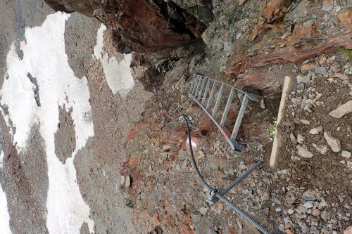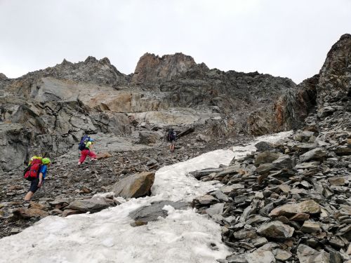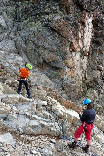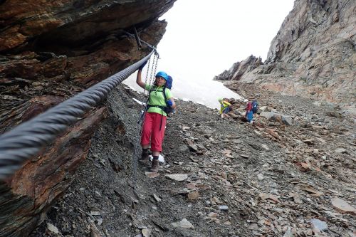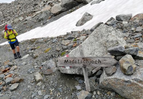 Madatschjoch je sedlo ve výšce 3030 m.n.m a momentálně vede jinudy, než před pár lety. Často tam padají šutry a povrch se mění, proto je třeba reagovat na schůdnost. Čtvrteční zásobovací vrtulník tam letěl s novým materiálem, tak se zase chystá nějaké kutění... Našinec má respekt spíš z těch železných částí cesty, jako jsou skoby a žebříky, jenže překonat suťoštěrkovou klouzačku misty napadanou na sněhu taky není žádná sranda. S Jáchoušem jsem si zase poklouzali a těšili jsme se na kurz, že nás v té hrůze naučí chodit směrem nahoru, nikoliv jezdit dolů. Vydrápat se nahoru po lanech už byla zábava. Na vrcholu sedla jsme děkovali vesmíru, že nám tehdá poslal do cesty toho pána, co nás sem tehdá nepustil, to by bylo bývalo asi nebylo dobré... Dali jsme sváču a opatrně slezli žebříky zpátky na cestičku a štrádovali si to k chalupě... Horský trenér nám pak vysvětlil,že se vlastně jedná o neoficiální ferratu a tím pádem, že se tam má chodit s jištěním. Ty dva páry, co jsme potkali šly taky jen tak. Kdysi se jednal prý o černou stezku, nicméně dnes nese označení "Alpin Route". Poslední den kurzu bychom tam měli jít...