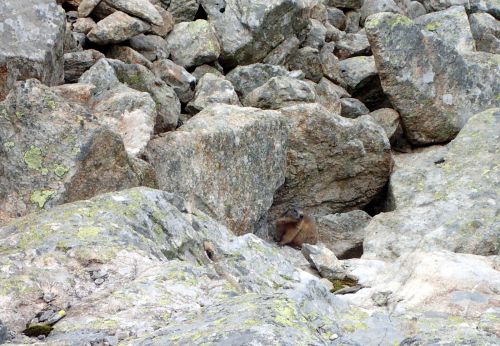 O pár metrů výš mlčí svišť, stejně nám ale neuniknul... A není ani zdaleka takovy komediant, jak ty ovečky.