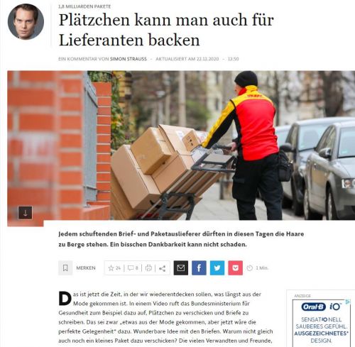 Často si jí ale nevzali, když byla bezdotykově, tak jsme jim ji nakonec začali dávat osobně. Měli velkou a upřímnou radost. No a pak psali na Frankfurter Algemeine Zeitung, že si balíčkáři zaslouží aspoň trochu cukroví.