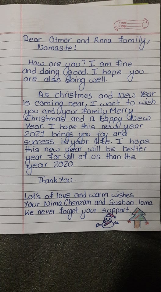 Po několika letech jsme tentokrát nekoupili k Vánocům žádný skutečný dárek u Člověka v tísni, ale poslali jsme pár euro našemu Nimovi. Čas placení školného pro Susana a Nimu se nekompromisně blíží a celá letošní sezóna je škrtnutá. Začali pěstovat brambory, aby měli co jíst, ale školné pro děti je pro ně nejvíc. Jestli má někdo z vás chuť naši nepálskou rodinu taky podpořit, dejte vědět... Ale hlavně na sebe dávejte pozor a držte se v této divnodobě!