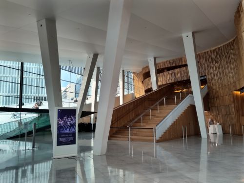 Budova byla navržena tak, aby lákala k posezení na sluníčkem vyhřátem kameni. Funguje. V zimě má naopak dobře odtávat sníh a eliminovat náledí. Nedokážem posoudit...