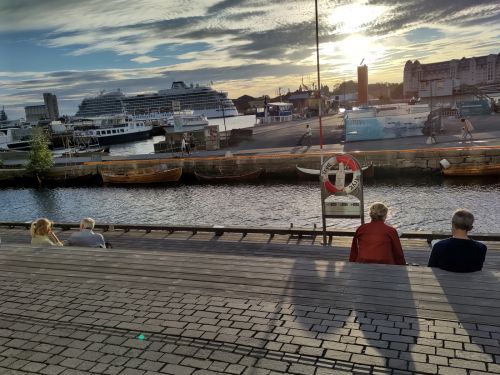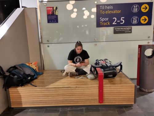 Část tratě se opravuje, proto jsme z letiště okusily v autobuse norskou dálnici do Hamaru. Ani nevim, jestli jsme se do Trondheimu těšily. Čekalo nás tam naplánované dobrodružství v podobě bezdomovecké noci. Naivní představa o zevlování na velkorysých lavičkách v parku se rozplynula už kolem sedmé večerní. Díky tamějšímu veletrhu rybaření jsme nakonec nezůstaly napospas studené černé noci samy. V Burgerkingu, kde jsme si daly horkou vodu na čaj, (pytlík jsme měly vlastní), ale oni ne, a tudíž jsme ani nic neplatily 😊, jsme narazily na dvě mladá devčata s báglama, která mluvila německy. Bylo mi jasné, že mají stejný program. Tj. uhnízdit se na pohodlných dřevěných lavičkách na nádraží až nad ránem otevře. Zatímco jsme po sobě nesměle pokukovaly, tulili se k nám s Eliškou mladí Norové pod vlivem. Vysvětlovali nám, že je na severu taková zima, že se tam nedá žít, ale že tady (podle nich prej na jihu) to není o moc lepší. Byť mluvil student trontheimské techniky skvělou angličtinou, povídala jsem si s ním česky v naďeji, že ho tím rychle setřepu. Eliška zírala, jak byl vytrvalý a houževnatý. Nedal se a pořád to zkoušel. Je houževnatost a odhodlanost nějaký znak tohoto národa? Nakonec, ale odešel a my se daly do hovoru s holkama ze Stuttgartu. Ukázalo se, že dneska přijely z Bodø a zítra pokračují do Oslo... Také byly na cestě s Intterailem, ovšem prej ho vyhrály v nějaké soutěži. Údajně probíha každý rok pro určitý ročník narození a výherců jsou mraky... Tak to dejte vědět maturantům ve vašem okolí... S holkama jsme se po probděné noci rozloučily a řekly si, že se třeba ještě uvidíme v Kodani...
