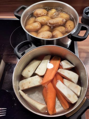 Hned, jak jsme dojeli, dali jsme vařit zeleninu na bramborový salát.