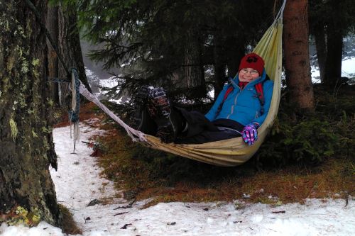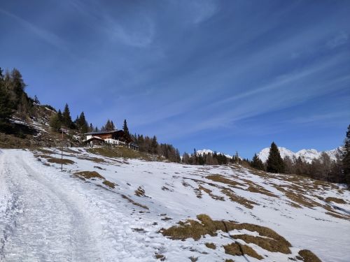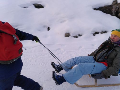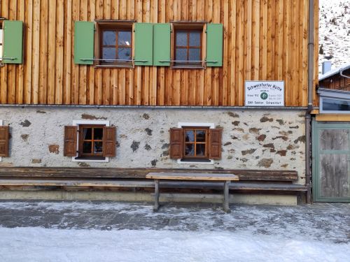 Schweinfurter Hütte na knedlíky s vidinou sáňkování do údolí. Ve čtyři jsme byli na chaloupce, jako na koni a když nám usměvavá číšnice sdělila, že jsou všecky sáňky pro dnešek pryč, zatuhl nám úsměv a mně stoupl tlak. Čelovky jsme s sebou neměli, jak jinak... Dali jsme si véču a mentálně se připravovali na dalších šest kilometrů po tmě. No, co, když je sníh, není nikdy vlastně černočerná tma...