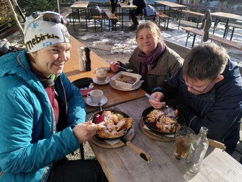 Letos jsme zvažovali i návštěvu bazénu nebo lázní, na to už ale nedošlo. Ovšem, Otíkoj se nakonec povedlo ukecat děti na ty Kaiserschmarrn na Simmering Almu. Vložil do toho značné úsilí, jelikož si užíval představu osmi set metrů převýšení v jeho vánoční výzvě. Asi tři dny jsem pak nemhla chodit, ale ty Kaiserschmarrn jsou pořád stejně božské.