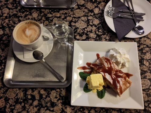 Po obědě u Pinkasů jsme se vydali královskou cestou na hrad a u fildy se nám sevřelo srdce. Nešlo jinak, než osladit život a to v Malostranské Besedě. Na lednovém meníčku mají jahodové blbouny a buchtičky se šodó. Otíkovi zazářili oči a objednal si vzrušeně vídeňskou kávu. Připadali jsme si, jako školkové děti na písku, které dostali nové bábovičky. To doma nemáme.