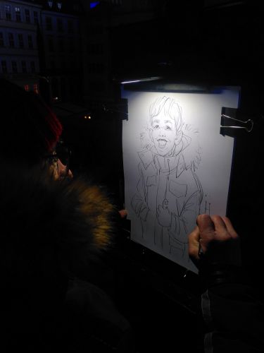Naše další kroky vedly z5 na Karlův most, kde si Jerry nechal namalovat na památku karikaturu. Statečně vydržel v mraze pózovat, jako správný Fin. Tentokrát jsme se trefili i do "celé" a cestou do Grand Cafe Orient, kde jsme chtěli rozmrznout, fandili ťapkajícím apoštolům na Orloji. V kavárně jsme si užili skvělý teplý štrůdl a Otík zklamání, že dnes nemají větrník. Spokojil se s kubistickým hranatým věnečkem.