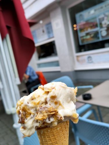 Po poledni nás už začal dohánět dešťový mrak a bohužel jsme museli zahučet do zmrzlinové manufaktury, než se to přežene. Kluci byli rychlejší, tak jim nezbylo nic jiného, než se spokojit s obyčejnou pekárnou... No, řeknu vám, že jsem chytla totálního nerva z budoucnosti! Objednat jsme si museli online přes QR kód a zaplatit paypalem! Platba nefungovala, paní zrzlinářka protočila panenky a problém vyřešila rychlostí blesku. Jestli mají být v budoucnosti všechny občerstvovací zařízení bez automatů s vlasama, tak chci včas umřít, abych se toho nedožila. Zrovna v kavárnách dělá personál duši lokálu. Nechápu to.