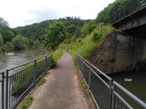 Sotva jsme najeli na cyklostezku, pokochali jsme se soutokem Weilu a Lahnu a i když nebylo ideální počasí na vodu, přeci jsme tu a tam potkali nějakou to kanoe.