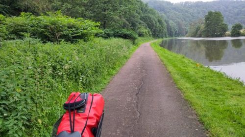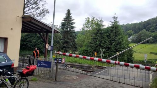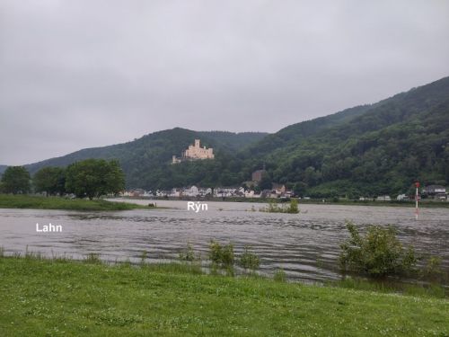 Věděli jsme, že cesta z Koblenz s kolama bude masakr! A byl. Na rozdíl od jiných cyklistů jsme se narvali hned do prvního vlaku, který jsme měli v hledáčku, pán Bůh nás má rád. Nebyl to ale ten den první vlak. V Obernhofu jsme narazili na ceduli, že je cyklostezka do Nassau zavřená a objížďka je vlakem. Ušetřili jsme si tak neplánovaně 6 km na naší 60 km dlouhé štrece. Voda v Lahnu byla směrem k Rýnu čím dál výš, tak kdo ví, co tam bylo za problém. Po silnici jsme jet nechtěli.
