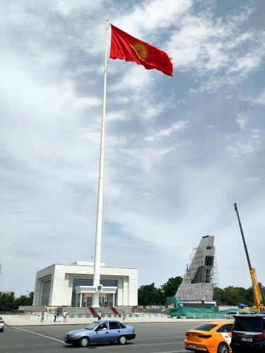 Ve Střední Asii narážíme na vysoko vlající vlajky. V Biškeku ji hlídá stráž, která se pravidelně střídá.