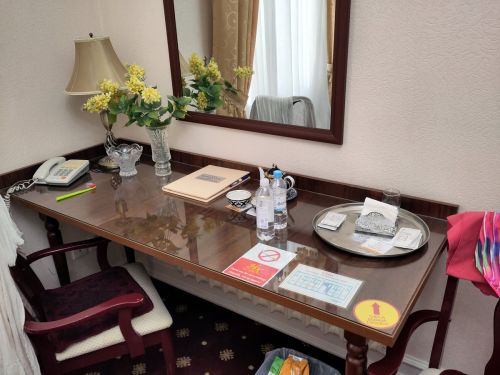 Na stole hotelového pokoje vidíte, kde je směr do Meky.