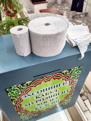 Děsně mě zaujal toaletní papír. Je natahovací a dvouvrstvý. Vzhledem k tomu, že se musí vyhazovat koše a nesmí se házet do záchoda, je jeho pružnost praktická na zabalení použitého toaleťáku.