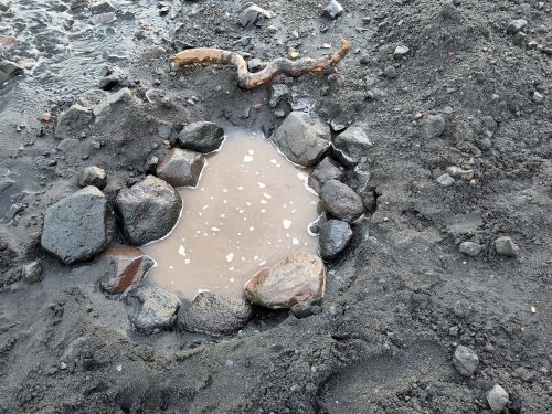 Brada nám, ovšem spadla, když jsme dojeli k bráně torii, utopené v popelu z výbuchu sopky v roce 1914. Cestou nás doprovázeli ochranné bunkry a všudypřítomné cedule, kde je nejbližší záchranný bod. Fascinovaly nás i betonová koryta na svádění lávy, která vedou od sopky k moři. V jednom takovém jsme našli i pláž, kam jsme se šli večer vycachtat a vyhrabat si vlastní onsen. To našel Jáchym na instáči jako oblíbenou kratochvíli Kagošimanů. Jak si vyhrabete díru, naplní se vám hnědou teplou bublající vodou. Fascinující. Pokoušela jsem se to zachytit,