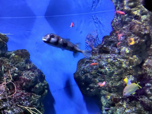 V Kagošimě děti lákalo akvárium, kam jsme přišli na začátku otevíračky. Bylo příjemně prázdné a klidné. Marně přemýšlim, zda jsme tam narazili na nějaké cizince. Spíše místní třígenerační rodinky s menšimi dětmi. Expozice se zaměřovala hlavně na místní živočichy, ochranu korálů a krátkodobá výstava ukazovala živočichy s recepty, co se z nich dá uvařit. To se děsně nelíbilo Elišce.